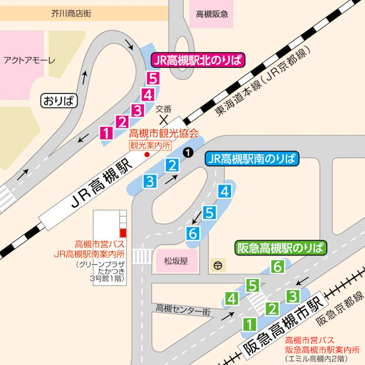 | JR・阪急各駅のバスのりば番号 | (1) JR高槻駅南4番・5番・6番 (2) 阪急高槻駅(徒歩) |